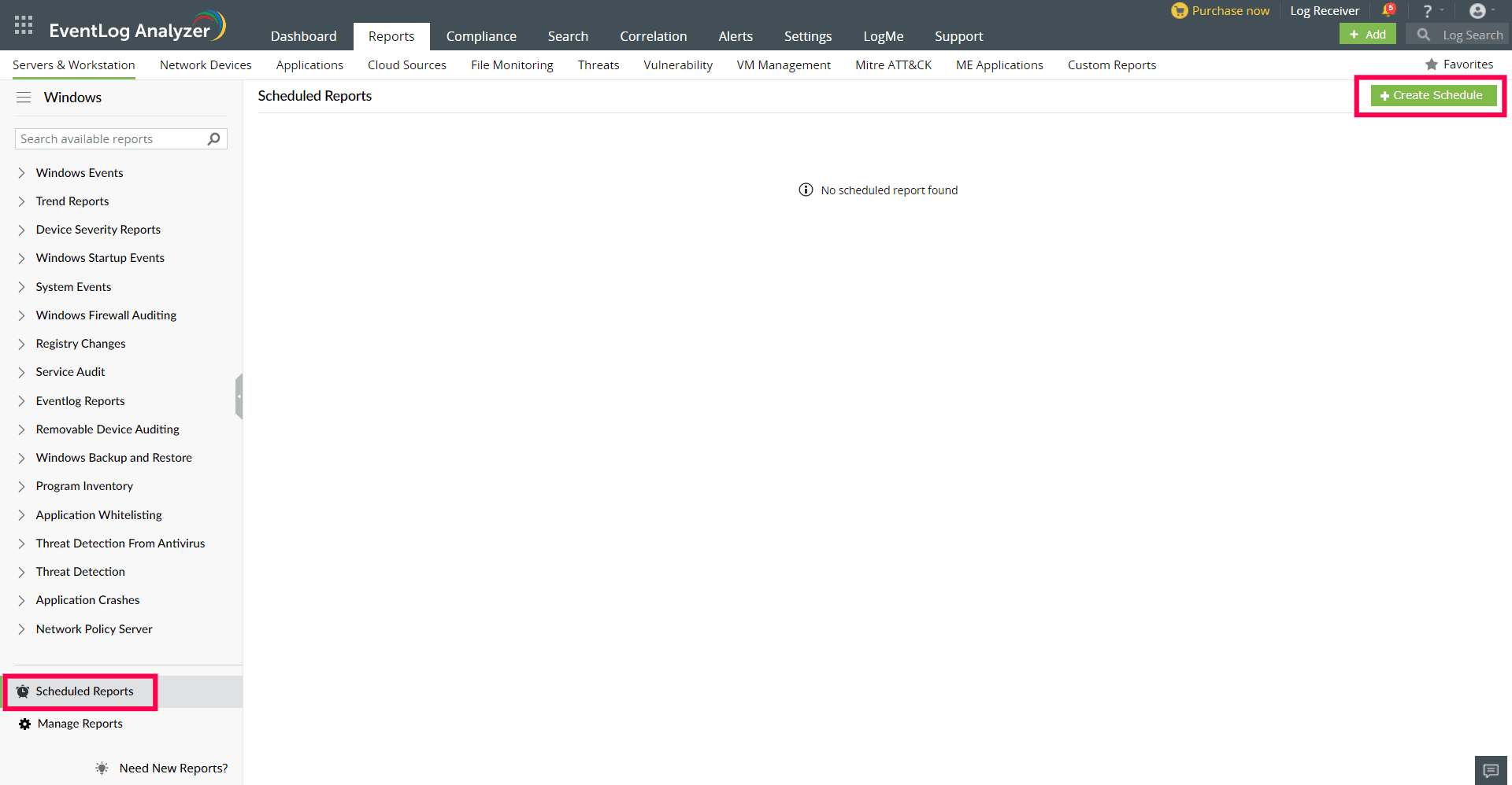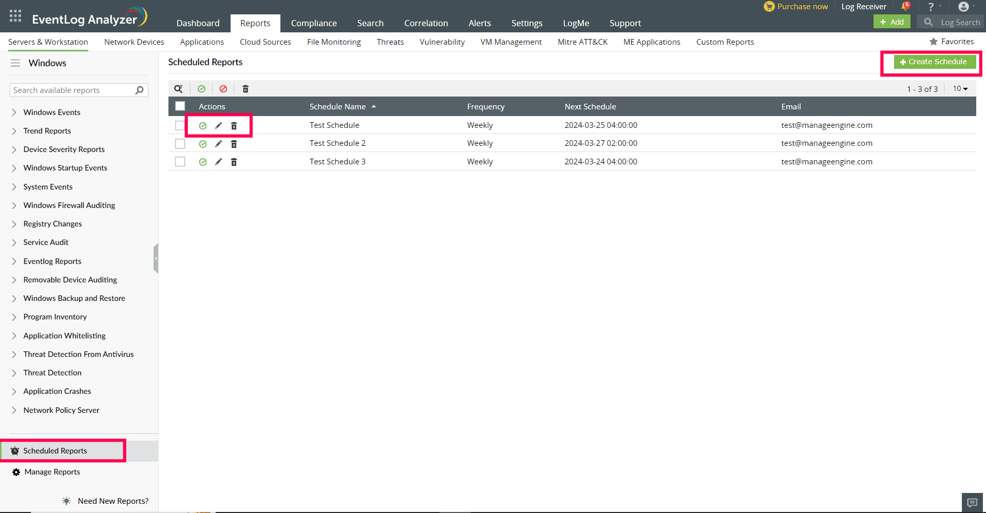EventLog Analyzer lets you schedule report generation, export, and redistribution over email. This page elaborates on the procedure to create and manage report schedules.